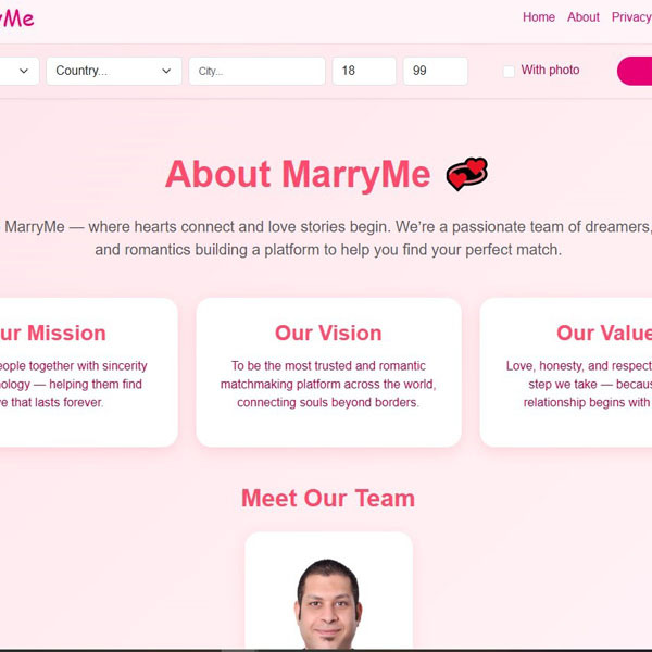 1) SPA .NET Core + APis + JWT + SQL Server + Blazor Server + SignalR, responsive for Tablet/Mobile/Computer, It has public live Chat for all users + Private Chat between every two users and live notifications, it could help you to find your soulemate easily using algorithms and your advanced search on the App, similar as https://www.internationalcupid.com.